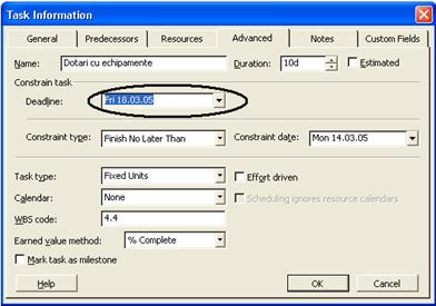In figura 2.38 se prezinta caseta de dialog Task Information cu ajutorul careia s-a fixat un termen limita de finalizare (deadline) pentru activitatea Dotari cu echipamente. Data este 18/03/2005.