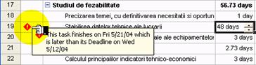 Daca printr-o operatie de reprogramare termenul final al activitatii pentru care s-a definit un deadline este astfel modificat incat intra in conflict chiar cu deadline-ul, utilizatorul va fi avizat asa cum se poate vedea in figura 2.39.