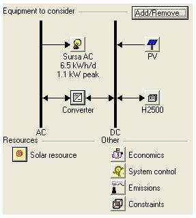 In sectiunea 1 se aleg echipamentele care sunt montate in sistemul de generare in cazul de fata: componente - PV, invertor si acumulatori, sarcina de curent alternativ (CA), iar in Figura 2 se prezinta alegerea/adaugarea acestor componente.