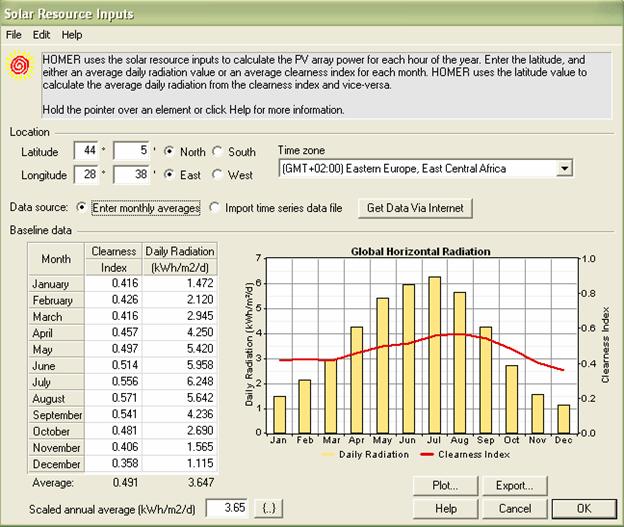 Dupa cum se poate observa sunt necesare si datele referitoare la intensitatea solara. In cele ce urmeaza se vor defini parametrii la fiecare echipament in parte. Se va incepe cu datele solare, acesteavor fi luate din masurarile de Radiatie Zilnica medie pe Luna ( exprimate in KWh/m2/zi) efectuate in sectiunea anterioara. Indicele de seninatate se va obtine cu ajutorul departamentului meteo al NASA fiind importate valorile prin intermediul internetului.