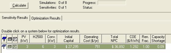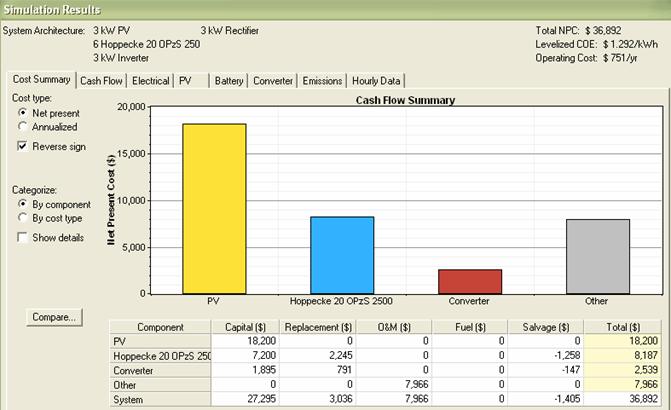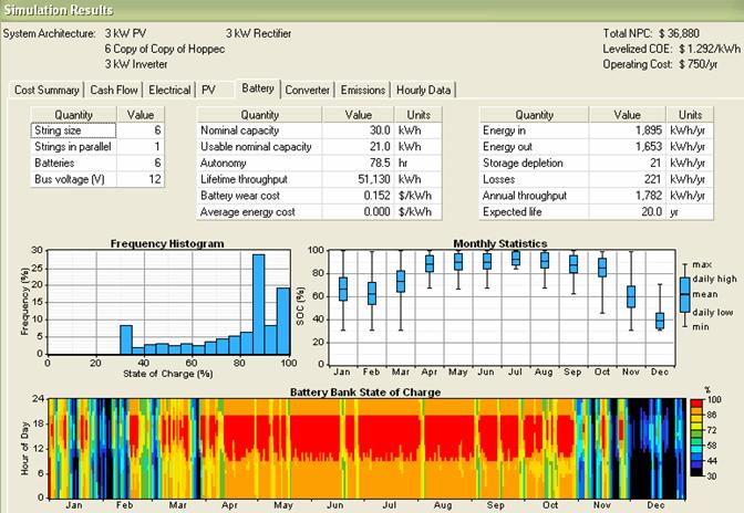 Programul simuleaza mii de configuratii, optimizeaza costul in timpul functionarii si genereaza rezultate ale analizei asupra tutor datelor de intrare, grafice cu variatii in timp (zi/luna/an) ale diverselor marimi ce intervin in sistem: putere produsa, energie vanduta, energie cumparata, energia sarcinii in cazul de fata, precum si reprezentari ale dependentelor dintre aceleasi marimi (Scattered Plots).