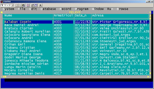 O baza de date reprezinta o colectie de date persistente. Din punct de vedere logic, baza de date este un set de tabele, impreuna cu un set de indecsi si cu anumite relatii stabilite intre tabele. Din punct de vedere fizic, baza de date este un fisier cu o anumita structura, memorat pe disc intr-un anumit director. In cazul limbajului FOX, tabelele care apartin unei baze de date, sunt memorate in fisiere separate, avand extensia .dbf.