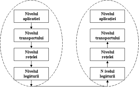 Coloana din stanga reprezinta nivelurile software utilizate de calculatorul de la originea (expeditia) mesajului, iar coloana din dreapta nivelurile utilizate de calculatorul de la destinatia mesajului.