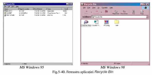 Sub MS Windows 95, in cadrul ferestrei aplicatiei Recycle Bin sunt afisate toate fisierele care au fost sterse pana in acel moment, dispuse in ordine alfabetica. Sunt afisate urmatoarele informatii referitoare la fisierele sterse: