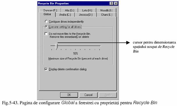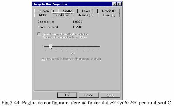 Dimensionarea spatiului ocupat de folderul Recycle Bin, prin specificare procentului afectat, din spatiul total de pe disc. Dimensionarea se realizeaza prin deplasarea cursorului din cadrul ferestrei. Valoarea implicita este 10%. Cursorul este deplasat cu ajutorul mouse-ului; se apasa butonul stang al mouse-ului si se mentine apasat in timp ce cursorul este deplasat. Se elibereaza butonul mouse-ului atunci cand procentul afisat pe ecran este cel dorit. Nu se recomanda alocarea unui spatiu mai mare decat valoarea implicita de 10% pentru Recycle Bin, pentru a nu diminua foarte mult spatiul aferent stocarii datelor si programelor.