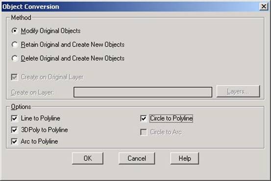 Activati optiunile Modify Original Objects, Line to Polyline, 3Dpoly to polyline, Arc to Polyline, Circle to Polyline. Apasati Ok.