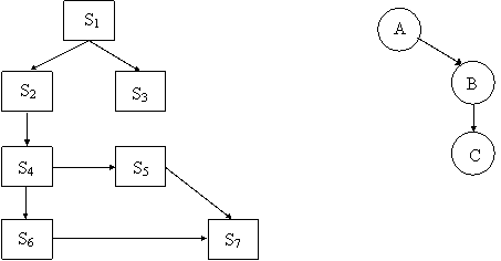 Consideram activitatile S1-S7 cu urmatoarele dependente (fig.1.2): (S1, S2), (S1, S3), (S2, S4), (S4, S5), (S4, S6), (S5, S7), (S6, S7), (S3, S7). Prin notatia (A, B), se intelege ca activitatea B se poate executa numai dupa ce s-a incheiat executia activitatii A. Sistemului de activitati prezentat ii pot fi asociate procesele A, B si C, unde.
