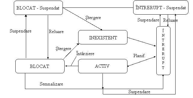 Alte operatii asupra proceselor sunt: semnalizarea, intarzierea, planificarea, schimbarea prioritatii, suspensarea si reluarea. Un proces poate fi semnalizat in legatura cu aparitia unui eveniment sau poate fi intarziat pana la aparitia unui eveniment. Pentru a obtine controlul unui procesor, procesele sunt planificate. Schimbarea prioritatii unui proces influenteaza modul de alocare a resurselor necesare procesului. Un proces INTRERUPT (respectiv BLOCAT) poate fi INTRERUPT-SUSPENDAT (respectiv BLOCAT-SUSPENDAT). Prin reluare, un proces BLOCAT-SUSPENDAT (respectiv INTRERUPT-SUSPENDAT) devine BLOCAT (respectiv INTRERUPT). Tranzitiile posibile ale unui proces pe timpul duratei sale de viata sunt (figura 1.3):