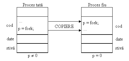 In UNIX procesele sunt create folosind apelul sistem fork. Procesul apelant se numeste proces parinte, iar procesul nou rezultat in urma apelului se numeste proces fiu. Initial, imaginile celor doua procese sunt identice, apoi ele pot avea propria lor imagine in memorie. Astfel, daca parintele asi modifica o variabila a sa, aceasta modificare nu este vizibila si pentru fiu, si reciproc. Fisierele deschise inainte de apelul fork, sunt partajate intre parinte si fiu. Prin urmare, daca un fisier a fost deschis de procesul parinte inainte de apelul fork, atunci el va fi descris si pentru procesul fiu.