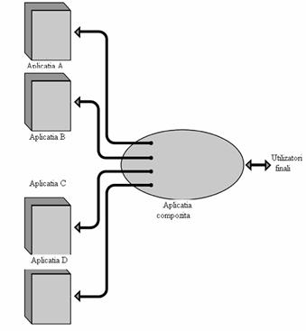 Integrarea prin portal permite vizualizarea unei multitudini de sisteme, atat interne unor intreprinderi, cat si externe acestora, printr-o interfata simpla de tip utilizator. Acest tip de integrare aduce un plus de beneficiu datorita evitarii problemelor de integrare si adaptarii interfetei utilizator a fiecarui sistem la o interfata utilizator comuna (interfata utilizator agregata), care este de cele mai multe ori un browser Web (Figura 4.1). Ca rezultat, toate sistemele participante sunt integrate intr-un browser, chiar daca aplicatiile nu sunt direct integrate in cadrul companiilor sau intre acestea.