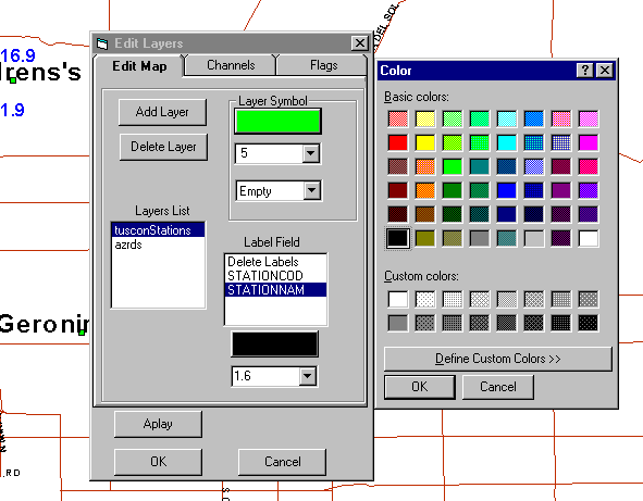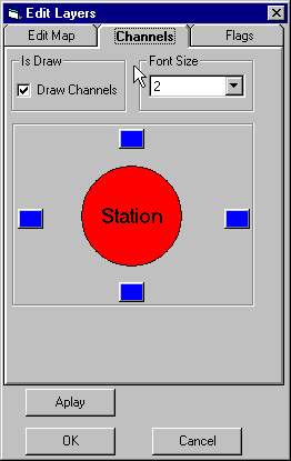 Cu tab editare harta puteti adauga sau sterge niveluri, seta culoarea si dimensiuena simbolurilor si culoarea si dimensiunea etichetelor in nivelurile individuale. Pe tab canalelor aratate mai jos puteti porni afisajul si seta dimensiunea valorilor statiei care vor fi afisate la pozitiile cardinal din jurul simbolului statiei. Si de la tab indicatoare puteti porni afisajul pentru indicatorul de vant pentru fiecare statie. Care monitoare si indicatoare vor fi afisate se determina in meniul configuratie al Enview.
