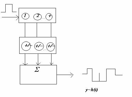 Algoritmul de determinare a raspunsului se poate construi urmarind circulatia semnalului in figura 2. Cele I impulsuri care formeaza semnalul sint citite si deplasate succesiv prin celulele liniei de intirziere (fiecare celula introduce o intirziere cu). Semnalele de la iesirile celulelor de intirziere (poate fi avuta in vedere si intrarea in prima celula) sint trimise la un sumator printr-un set de circuite care pastreaza semnul acestor semnale sau il inverseaza.