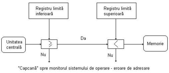 Protejarea memoriei - in general, se doreste protejarea monitorului rezident fata de eventualele actiuni ale programelor utilizator, precum si protejarea programelor utilizator unul fata de altul. Toate aceste sarcini revin hardware-ulu Protejarea continutului memoriei situate inainte si dupa zona ocupata de un program executabil se poate realiza folosind doi registrii limita, care sa stocheze valorile limitelor superioara si inferioara ale adreselor fizice