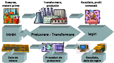 Daca un proces de prelucrare accepta materii prime ca elemente de intrare si produce bunuri finite ca elemente de iesire, un sistem informational poate fi imaginat ca un sistem care accepta date ca element de intrare si le prelucreaza in produse de tip informatii ca element de iesire (figura 1.3).