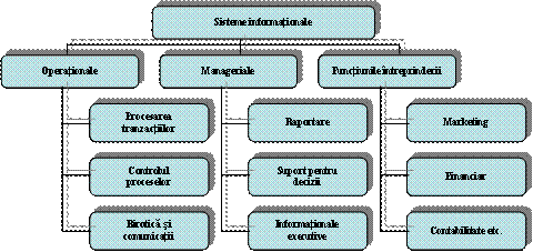 Figura 1.11 ilustreaza relatiile dintre sistemele informationale manageriale si sistemele informationale operationale in raport cu functiunile intreprinderii. Sistemele informationale manageriale sprijina necesitatile de luare a deciziilor ale managementului strategic, tactic si operational. Sistemele informationale operationale sprijina cerintele de procesare a informatiilor implicate de o anumita activitate.