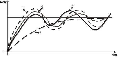 in sistemele economice, feedback-ul negativ (ca element de baza in identificarea comportamentului) se constituie intr-un mecanism de control, de autoreglare, care cauta sa evite extremele in functionarea sistemului si sa mentina un echilibru relativ eficient al sistemului. Din punct de vedere al comportamentului unei bucle feedback negative (figura 1.14) se cunosc patru moduri fundamentale care nu pot aparea in forma lor pura in sistemele reale: raspuns neted (1), oscilatie amortizata (2), oscilatie intretinuta (3) si oscilatie exploziva (4).