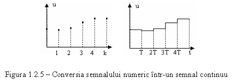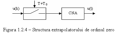 Figura 1.2.5 pune in evidenta semnalul numeric (valori numerice) si semnalul analogic obtinut prin extrapolare. Trecerea de la un tip de semnal la altul se realizeaza cu un extrapolator de ordinul zero care, mentine constanta valoarea functiei la iesire, pe parcursul unei perioade de esantionare. Daca se considera aplicat la intrare un impuls unitar, raspunsul acestui element de extrapolare se poate calcula ca diferenta a doua trepte unitare, iar functia de transfer asociata acestuia este in relatia (1.2.2.1):