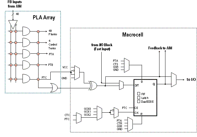 Macrocelula unui CoolRunner II este extrem de eficienta si profilata pe creatia logica. Functiile uilizate sunt combinationale sau registrii. Schema unei astfle de macrocelule este prezentata in figura de mai jos:
