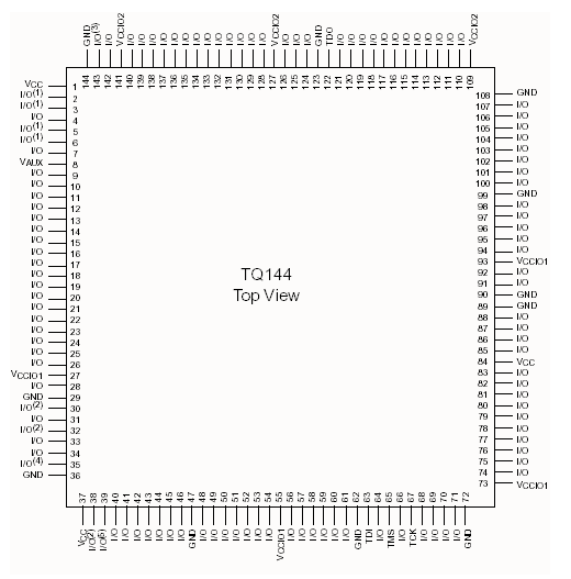 In figura de mai jos este prezentata structura unui XC2C256-TQ144 CoolRunner 2 acest circuit are urmatoarele caracteristici: dimensiunea este de 20mm x 20mm, distanta intre pini este de 0.5 mm iar numarul de intrari/iesiri este 118.