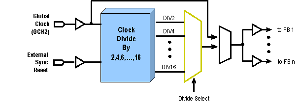 Clock division a fost introdus in arhitectura CoolRunner II CPLD pentru a divide un ceas global extern. Dividerile care sunt posibile sunt cu 2,4,6,8,10,12,14 si 16. aceasta posibilitate de dividere se poate implementa cu ajutorul unui pin:GCK2. in figura 1.3.3.4 este prezentata stuctura unui astfel de ceas.