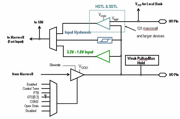 Blocurile I/O (blocurile de intrare/iesire) :fiecare intrare sau iesire poate functiona automat pt voltajul necesar sau poate fi programata sa functioneze pe acel domeniu.in figura 1.3.3.5 este prezentata arhitectura blocului de intrare/ iesire.