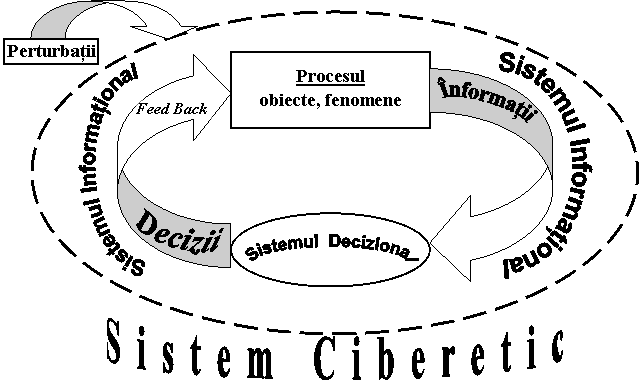 Ca o prima observatie trebuie sa remarcam ca sistemul cibernetic, este un sistem semiinchis (este influentat de anumite perturbatii externe), format din procesul respectiv, dintr-un sistem informational si unul decizional.