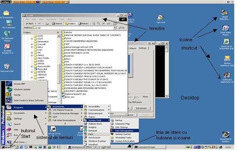 Daca plasam directoare sau fisiere direct pe desktop (care este de fapt un director), acestea vor aparea tot sub forma. La instalarea sistemului de operare se plaseaza in mod automat cateva icoane pe desktop, cum ar fi MyComputer, sau RecycleBin.
