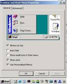 In cadrul panoului General putem alege ca bara sa apara permanent pe ecran (Allways on top),ca bara sa apara numai atunci cand deplasam cursorul peste ea (Auto hide), sa afiseze pictograme mici in Meniul Start (Show small icons in Start menu), sa afiseze ora exacta (Show clock). In cadrul panoului Advanced putem sa adaugam (Add) sau sa stergem (Remove) scurtaturi la anumite aplicatii din Meniul Start.