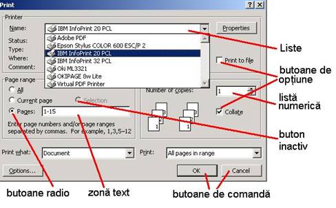 Listele se pot derula apasand sageata din dreptul lor, iar selectia se face prin click pe elementul dorit. Butoanele de optiune permit selectarea/deselectarea unei optiuni care modifica modul de executare a comenzilor asociate. Se pot selecta una sau mai multe optiuni de acest fel. Daca optiunile se exclud reciproc se folosesc butoanele radio, la care selectarea unui buton dintr-un grup conduce la deselactarea altuia, intotdeauna pot sa am o singura optiune selectata. Daca executarea comenzii presupune setarea unei valori numerice se pot folosi listele numerice sau cursoarele pentru selectie. Daca dorim sa introducem informatii nedefinite putem folosi zonele de text. In anumite conditii unele selectii nu au sens, sau selectarea unei optiuni conduce la inhibarea altor optiuni. Butoanele corespunzatoare acestor selectii apar ca inactive, lucru marcat si printr-o culoare mai stearsa. Pe fereastra de dialog putem avea butoane de comanda ce au ca efect aparitia unei noi ferestre de dialog. Confirmarea comenzii sau renuntarea la executare se poate face prin butoanele de comanda cu inscriptia OK, respectiv Cancel.