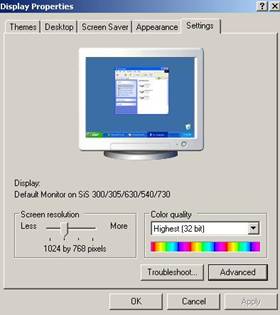 Pe fisa Settings putem seta numarul punctelor ce alcatuiesc imaginea pe ecran (Screen rezolution) precum si numarul nuantelor de culori (Color quality). Aceste setari trebuie sa fie in concordanta si cu memoria de pe adaptorul video.