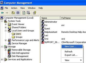 Aici putem crea utilizator nou de exemplu prin buton dreapta peste un loc liber si alegerea comenzii New User. Pentru acest utilizator putem determina numele, parola si apartenenta la grupurile existente. Dupa ce am definit utilizatorul, putem sa-l includem in drepturile de acces ale resurselor sau in permisiile obiectelor. Sub WindowsXP avem in Control Panel si o icoana User Accounts prin care putem defini utilizatori locali cu un wizard.