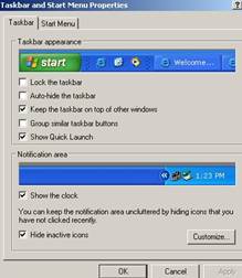 Aici putem stabili continutul taskbar-ului, de exemplu daca dorim sa fie afisat ceasul sau unde sa fie plasat linia de stare. Putem specifica formatul in care sa apara taskbar-ul, iar cu butonul Customize putem defini marimea icoanelor sau forma meniului Start.