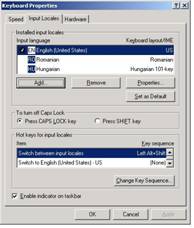 La versiunile dinaintea lui XP setarea caracterelor nationale de pe tastatura se gaseau tot in meniul Keyboard, in XP acestea s-au mutat in meniul Regional and Language Options.