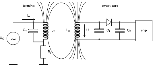 Principiul functionarii se bazeaza pe pierderile cuplajului transformatorului .Un camp magnetic de frecventa inalta este generat de o bobina din interiorul terminalului cu scopul de a transfera energie.Cele mai folosite frecvente sunt 125kHz si 156MHz ce corespund unor lungimi de unda de 2400m, respectiv 22m.Lungimile de unda ale campului electromagnetic sunt de cateva ori mai mari decat distanta de la terminal la card, ceea ce inseamna ca acesta trebuie sa se situeze in apropierea terminalului.Astfel poate fi aplicat modelul pierderilor cuplajului transformatorului.Daca un card fara contact este adus in apropierea terminalului, o parte din campul magnetic generat de acesta va trece prin bobina din card si va induce o tensiune Ui. Aceasta tensiune are scopul de a furniza energie cipului.Cum cuplajul intre cele doua bobine este mic, eficienta metodei este scazuta.Un curent mai mare este deci necesar prin bobina din terminal pentru a atinge un nivel ridicat al puterii campului.Acesta se obtine prin conectarea in paralel a unui condensator Ct cu bobina Lt, cu o valoare a capacitatii aleasa astfel incat bobina si condensatorul sa formeze o retea de rezonanta paralel a carei frecventa de rezonanta coincide cu frecventa semnalului de transfer.