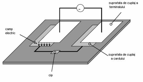 Fig 6 Principiul de operare al cuplajului capacitiv.Cuplajul apare prin alaturarea celor doua campuri electrice conductive de pe suprafata cardului si a terminalului.