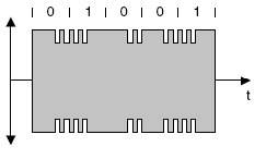 Pentru transmisia capacitiva de date de la card spre terminal o pereche de suprafete de cuplaj este folosita, depinzand de orientarea cardului fata de terminal, fie E1 si E2 sau E3 si E4 cum este aratat in Fig 10. Cealalta pereche de suprafete de cuplaj poate fi folosita pentru transmisia in directia opusa.Cum cardul trimite date catre ATR prin o singura pereche particulara de suprafete de cuplaj, terminalul poate recunoaste orientarea relativa a cardului.Diferenta maxima de potential intre o pereche de suprafete de cuplaj este limitata la 10 V, dar trebuie cel mult sa depaseasca diferenta de potential a receptorului(300mV).Codarea NRZ diferentiala este utilizata pentru transmisia de date.Transmitatorul genereaza codarea prin inversarea voltajului intre suprafetele E1 si E2 sau E3 si E4.Starea de baza reprezentand 1 logic este inca odata stabilita in intervalul t3 (vezi Fig 14).Astfel fiecare inversare de polaritate reprezinta o schimbare a starii logice.