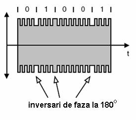 Fig.11 Principiul de functionare al modulatiei de faza pentru transmisia de date pentru smart card-uri fara contact. Graficul de mai sus indica campul magnetic alternativ si starile de faza asociate.Frecventa purtatoarei este 4.9152 MHz, iar a subpurtatoarei e 307.2kHz