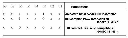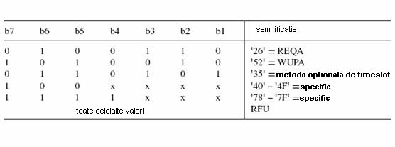 Tabel 8 Codarea byte-ului PARAM.Bit-ul b4=0 indica o comanda REQB(toate cardurile in starea Idle sau Ready raspund la aceasta comanda).Bitul b4=1 indica o comanda WUPB(toate cardurile in starea Idle, Ready sau Halt raspund la aceasta comanda)