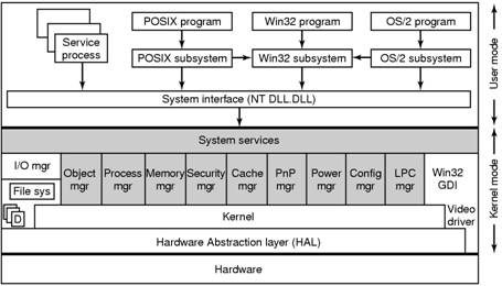 In figura de mai jos sunt prezentate principalele componente ale sistemelor de operare de tip Windows XP. Pe aceasta figura se poate observa divizarea componentelor in trei straturi