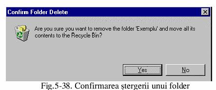 Al doilea exemplu va sterge folderul EXEMPLU de pe discul C. Se va selecta folderul in fereastra Explorer utilizand butonul drept al mouse-ului, moment in care va fi afisat meniul contextual. Din optiunile disponibile se va alege Delete.Este afisat mesajul din caseta dialog din figura 5-38 si se apasa butonul Yes