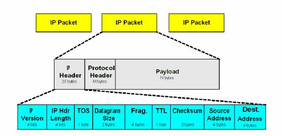 Protocolul IP (Internet Protocol) este cel care determina felul in care pachetetele sunt transmise printr-o retea care se bazeaza pe acest protocol, de la entitatea care transmite catre entitatea care receptioneaza.Pachetele sunt elementele transmise si receptionate de la un capat la altul, iar acestea sunt transmise de la un segment al retelei la altul de-a lungul intregii retele.Fiecare nod de retea (sau router) are caracteristicile retelei din care face parte, de exemplu unele routere ar putea fi Routere Fast Ethernet, in timp ce alte noduri ar putea fi modemuri cu viteze reduse. Pentru a optimiza performanta nodurilor, anumite sisteme ale retelei au rolul de a fragmenta datagramele in unitati mai mici ce vor fi reansamblate odata ajunse la destinatie.