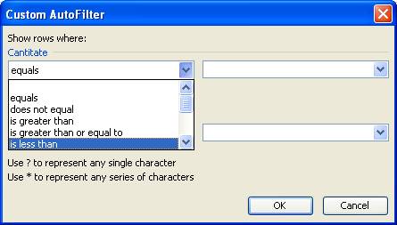 Trebuie sa scriem criteriul de filtrare in foaia de calcul respectind numele coloanei si simbolurile de comparatie: =, >=, <=, <> (diferit)