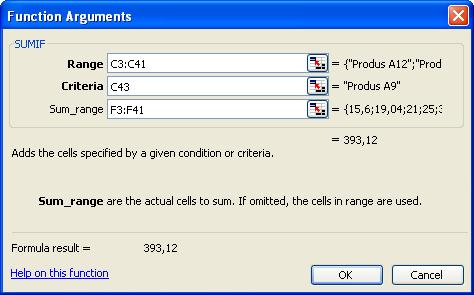 Sintaxa: SUMIF(blocul de cautare care contine conditia;conditia;blocul de insumare - care contine sumele)