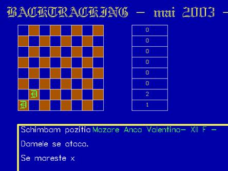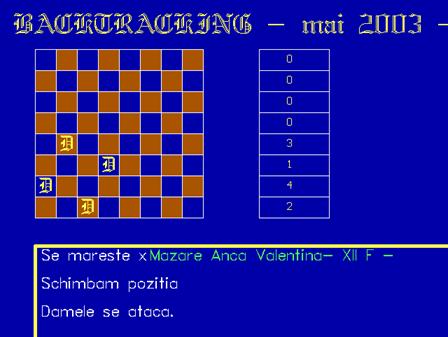 Invatamantul modern presupune utilizarea unor mijloace de prezentare a informatiei intr-o forma dinamica si care sa simuleze realitatea. Se stie ca fiinta umana invata mai usor prin joc. Acest proiect ajuta elevii sa invete mai usor tehnica backtracking prin prezentarea unei interfete in cazul problemei damelor.