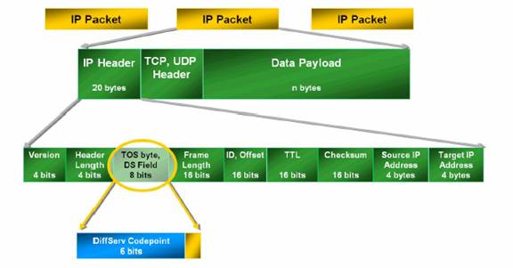 Majoritatea aparatelor telefonice IP si gateway-urile VoIP seteaza acest octet cu o valoare diferita de 0 (zero) pentru a indica prioritatea ceruta in tehnologia VoIP. O valoare folosita in general pentru aceast octet este 160 sau binar 10100000.Uneori aceasta valoare este mentionata ca "5" deoarece primii trei biti reprezinta valoare 5 in binar. Traficul VoIP de stabilire a apelului foloseste in general o alta valoare: 96 sau binar 01100000.Campul DSPC creaza o schema eficienta pentru clasificarea diferitelor tipuri de trafic.Daca un singur router din reteaua prin care circula datele pana la destinatie nu recunoaste DSPC-ul, atunci intreaga cale poate fi considerata ca una fara garantii.
