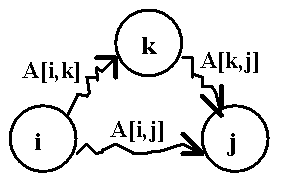 Algoritmul utilizeaza o matrice A de dimensiuni NxN, in care A[i,j] va fi lungimea drumului minim de la i la j. Initial, se presupune ca drumul minim de la i la j este arcul (i,j). Se testeaza apoi fiecare nod k al grafului, pentru a vedea daca pentru fiecare pereche de noduri i,j nu exista un drum mai scurt de la i la j trecand prin k (figura 1), adica daca suma drumurilor minime de la i la k s i de la k la j nu este mai mica decat drumul considerat minim de la i la j.