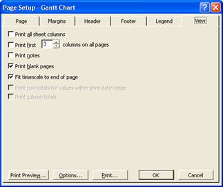Problema care apare la tiparirea proiectelor este legata de numarul mare de coli necesare. Acesta este si motivul pentru care frecvent tiparirea proiectelor se face pe plottere. In principiu, tiparirea proiectelor seamana mult cu tiparirea foilor de calcul Excel. Ca si acolo (si nu numai acolo) exista antet (header), subsol (footer) - ambele organizate pe trei zone: stanga, centru si dreapta. In plus, in cazul Microsoft Project, mai apare si asa numita Legenda (si ea organizata pe cele trei zone amintite anterior). Toate setarile legate de pagina se pot controla cu ajutorul campului FileÞPage Setup. Caseta de dialog omonima poate fi vazuta in figura 4.1. Sectiunea View, permite controlul unor elemente specifice ale paginii tiparite Microsoft Project.