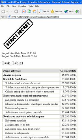 In animatia de mai sus, se va salva in format html informatia despre proiect, concomitent cu definirea formatului de extragere a datelor. Astfel, se va extrage informatia despre resurse. Fisierul rezultat va contine si capul de tabel (numele campurilor considerate) si o imagine. Se vor extrage numai campurile corespunzatoare numelor activitatilor (Name), respectiv costurilor (Cost). Noile nume ale acestor campuri vor fi Nume activitate, respectiv Cost activitate