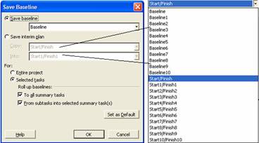 Se pot salva linii de baza sau planuri interimare pentru intregul proiect sau pentru activitati selectate.