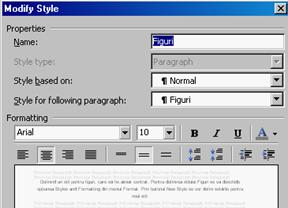 Definind un stil pentru figuri, care sa fie aliniat centrat. Pentru definirea stilului Figuri se va deschide optiunea Styles and Formatting din meniul Format. Prin butonul New Style se vor defini setarile pentru noul stil, asa cum este exemplificat in figura 1. Definirea unui stil pentru figuri prezinta avantajul de a evita modificarile repetate ale textului redactat in stilul Normal, care maresc inutil durata redactarii si incarca memoria documentului.
